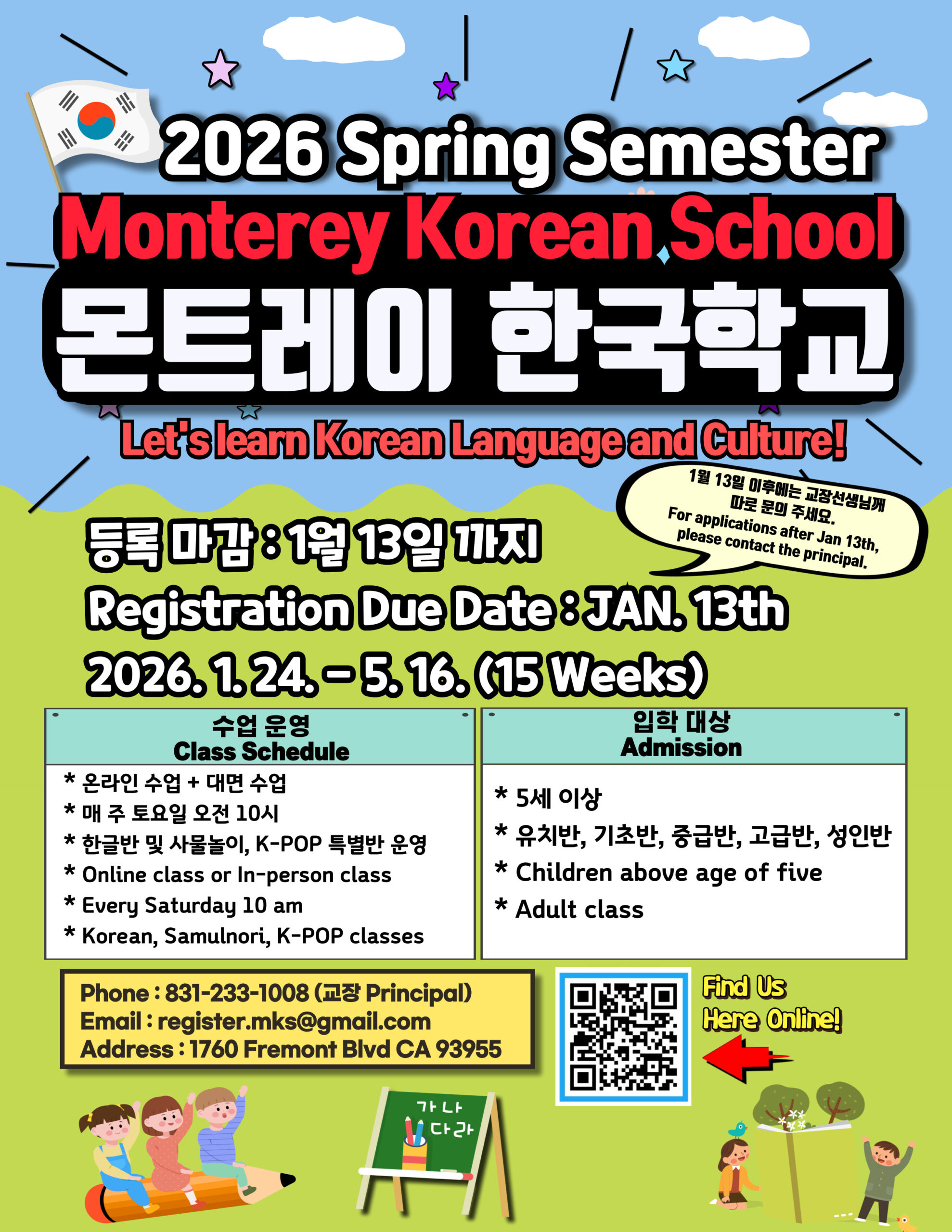 Let’s learn Korean Language and Culture! 몬트레이 한국학교에서 2026년 봄학기 신입생을 모집합니다. 한국어와 한국 문화를 배우고 싶은 모든 분을 환영합니다.